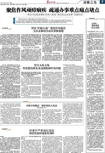 党史学习教育开展以来,青岛市纪检监察机关立足职责定位、瞄准重点领域,深入开展作为市级“我为群众办实事”项目的“护航项目落地、推动工作落实——纪委监委在行动”、群众身边腐败和作风问题专项整治。工作中,聚焦作风顽瘴痼疾、疏通办事难点痛点堵点,督促相关职能部门解决群众“急难愁盼”问题,扎实推进“我为群众办实事”实践活动,不断增强人民群众的获得感、幸福感、安全感。