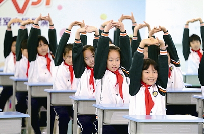 ■日前,青岛福州路小学室内操展演在学校体育馆拉开帷幕。学校依据不同年级段学生的年龄特点,创编7套室内课间操,让孩子们在锻炼身体的同时感受艺术旋律,展现运动之美。 韩 星