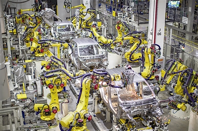■重庆一家新能源汽车企业使用智能化焊接机器人进行焊接作业。 新华社照片