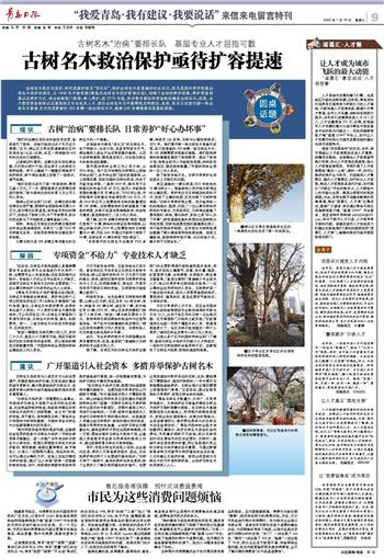 古树名木是历史变迁、时代发展的绿色“活化石”,保护古树名木是普遍的社会共识。我市是国内较早实施古树名木保护的城市,从1990年开始实施《青岛市古树名木保护管理办法》,明确了古树的养护职责、养护资金来源以及养护方式,使古树有部门管理、有人养护。自2016年起,我市每年都安排资金救治濒危古树名木。但是,由于救治资金有限以及基层缺乏专业技术人才,部分古树名木仍不能得到及时救治。目前,我市正在进行新一轮古树名木普查,在已完成普查的300多棵一级古树名木中,就有200多棵需要采取复壮措施。