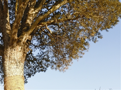 记者探访时看到,这棵白皮松存在病虫害,不仅部分枝叶干枯,而且树干上的树皮大面积脱落。树干上缠绕了一圈圈的草绳用于保护树皮,树干周边地面上安装了一些排水、透气设施。