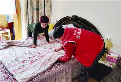 ■街道社区工作站的志愿者给老人缝被子。 北 讯 摄