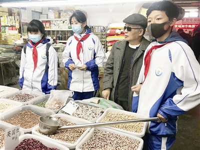 ■3名小志愿者陪失明老人选购干果。 黄 飞 摄