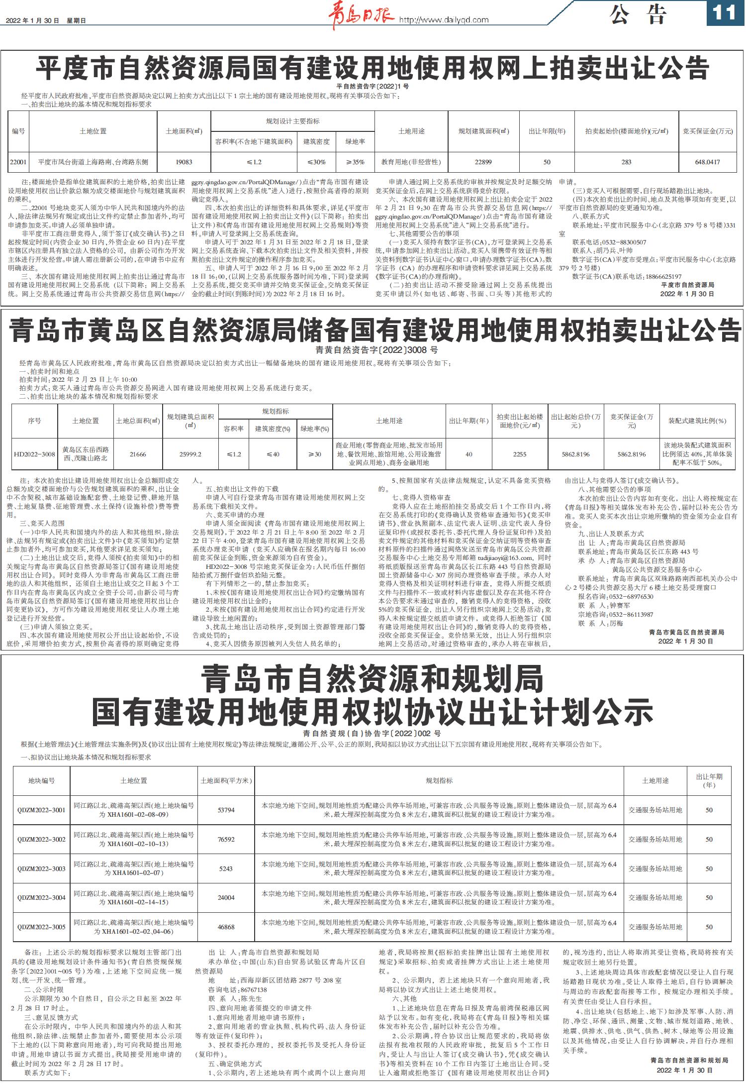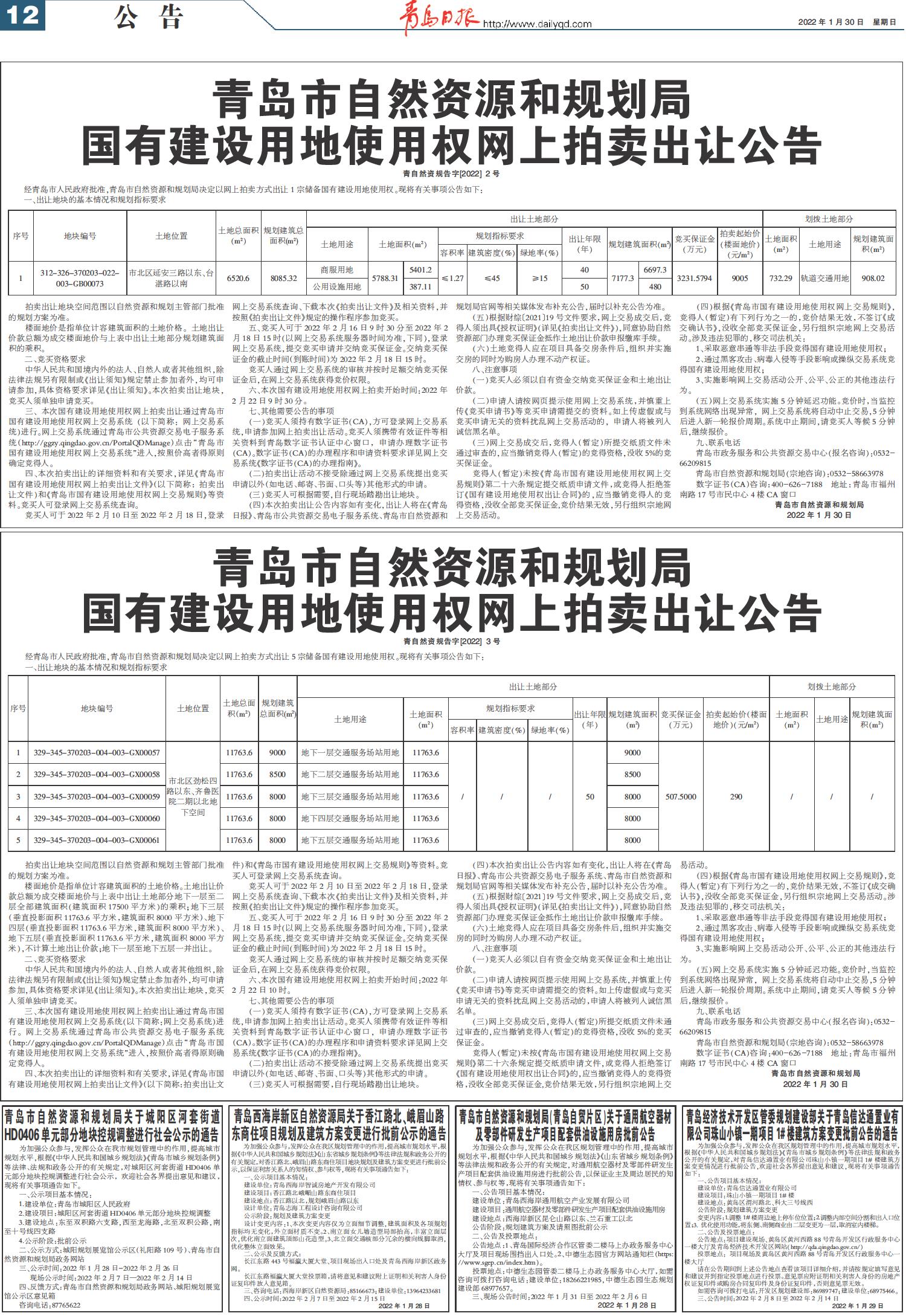 青岛市自然资源和规划局国有建设用地使用权网上拍卖出让公告