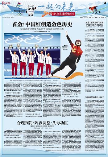 本报2月5日讯 在今晚北京冬奥会短道速滑混合团体接力决赛中,由武大靖、任子威、范可新和曲春雨组成的中国队以2分37秒348的成绩夺得冠军,为中国代表团夺得本届冬奥会的首枚金牌。