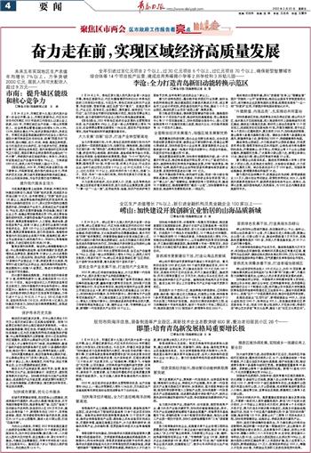 《报告》提出,2022年,市南区将拿出新打法、啃下硬骨头、开拓新领域,提升现代服务业活力,传承保护历史文脉,聚力城市更新建设和数字城区建设,优化公共服务供给,为全市发展打造市南样板。