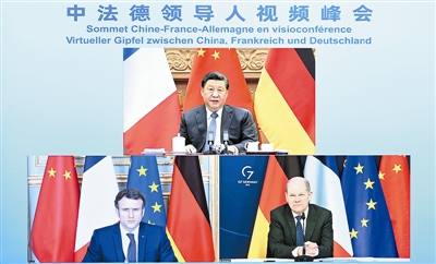 3月8日下午,国家主席习近平在北京同法国总统马克龙、德国总理朔尔茨举行视频峰会。 新华社照片