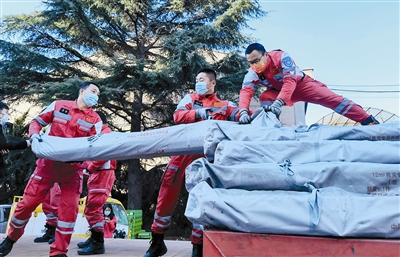 ■3月8日中午11点半,两辆满载棉帐篷、棉衣等防疫物资的货车离开青岛市红十字会备灾救灾仓库,驶往莱西。据市红十字会工作人员介绍,此次防疫物资包括棉帐篷257顶、棉衣6000件,主要用于解决卡口工作人员和志愿者们的保暖问题。 韩 星 摄影报道