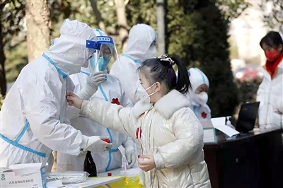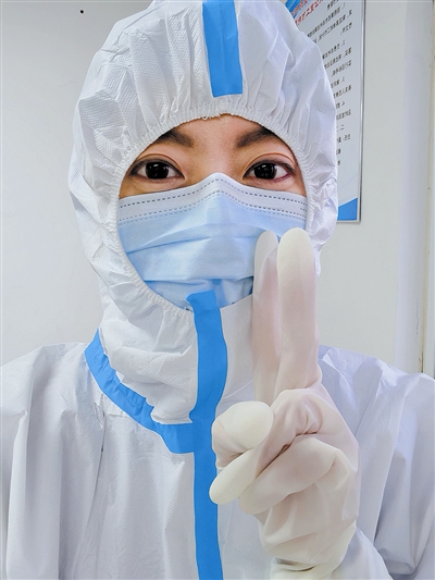 ■3月8日,莱西市一处核酸检测点,一位小姑娘在医护人员防护服上贴上了小红花。