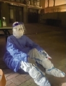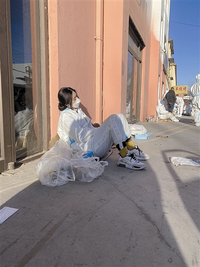 一位身着防护服的女性,坐在地上倚墙休息,不知不觉睡着了,略显凌乱的头发,眉眼间满是疲惫,下午阳光的照射下,她在墙上的影子拖得老长,门玻璃上映照出她并不坚实的后背,旁边还杂乱地摆放着几个塑料饭盒……