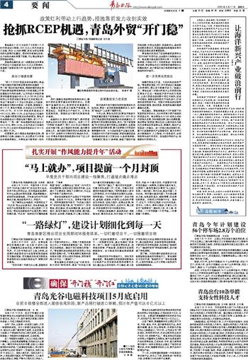 青岛海关则启动了促进跨境贸易便利化“百日冲刺”专项行动,出台提升口岸智能化水平、推进重点商品通关便利化等5个方面18条举措,力争在今年5月底前形成一批改革创新成果,带动青岛关区口岸营商环境持续优化和整体提升,助力青岛打造口岸营商环境示范高地和标杆城市。
