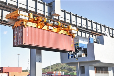 ■空轨集装箱即将通过海关机检检查设备。 陈星华 摄