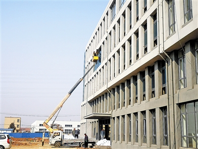 在1号框架车间楼前,几名工人站在工程车升降臂上,正在安装玻璃幕墙。而在综合办公楼一侧,一辆吊车伸出长长的吊臂,协助工人铺设楼顶防水保护层。“工地重视安全施工,用工程车全部取代以往的‘搭架子’。”孙奎茂说,目前工地有50多名工人,虽然人数不多,但涉及多个工种,人员组成较为复杂。为严把疫情关,工人每天进场必须登记、测温,严禁与工程无关人员进入。