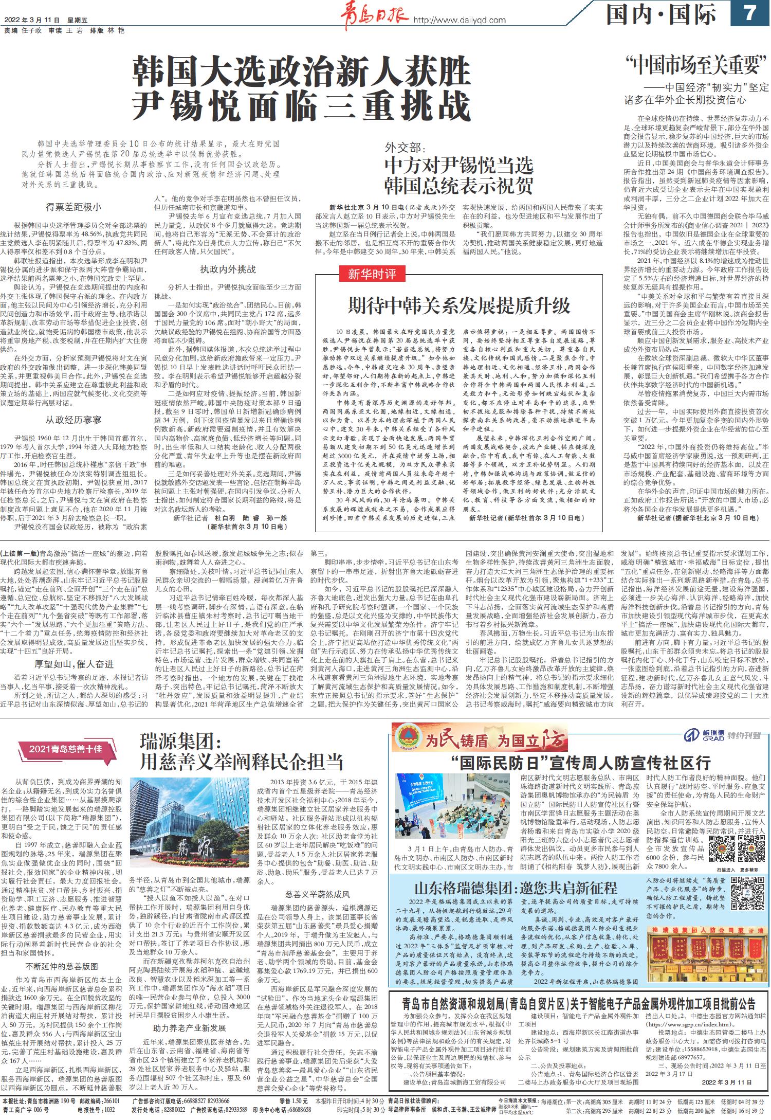 中方对尹锡悦当选韩国总统表示祝贺