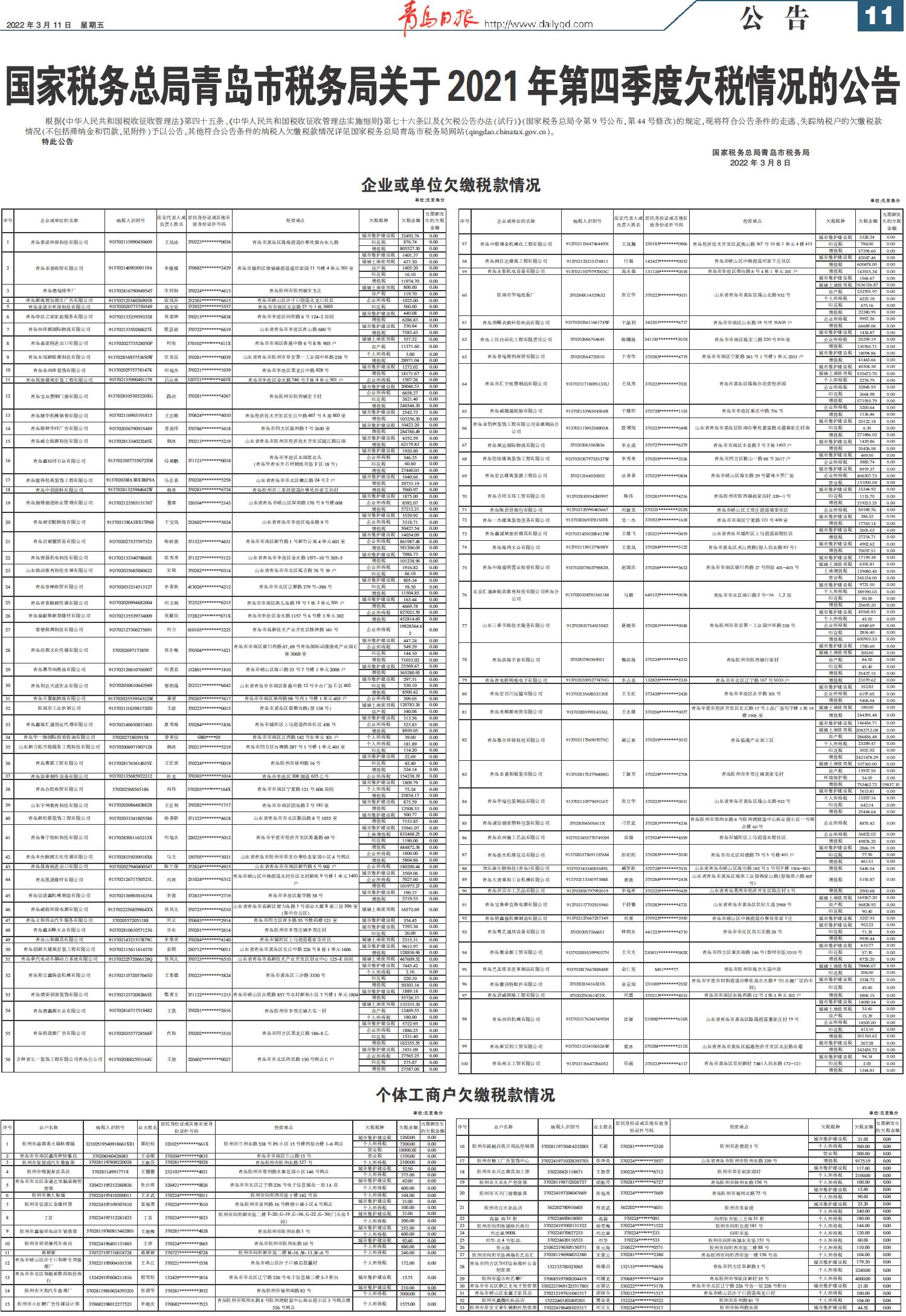 国家税务总局青岛市税务局关于2021年第四季度欠税情况的公告