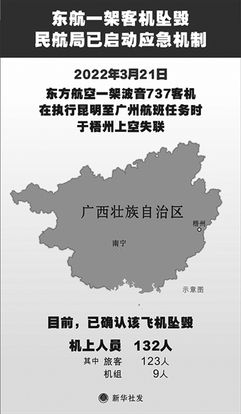 新华社北京3月21日电 3月21日14时38分许,东方航空公司MU5735航班执行昆明-广州任务时,在广西梧州市上空失联并坠毁。机上载有乘客123人、机组人员9人。