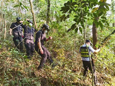 3月21日,广西藤县公安局民警在坠机现场周边搜救(手机照片)。 新华社照片
