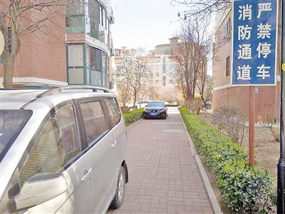 ■我市某智慧社区的消防通道上停放了多辆私家车。