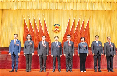 新当选的市政协领导班子成员(左起:崔作、李苏满、刘光烨、汲斌昌、陈大维、姜巧珍、张元升、刘卫国)。 于 滈 摄