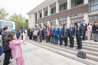 ▲闭幕会后,委员们在市人民会堂前合影留念。
