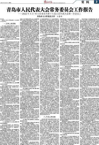 2022年,将召开中国共产党第二十次全国代表大会,这是党和国家事业发展进程中十分重要的一年,也是新一届市人大及其常委会依法履职的第一年。市人大常委会要在市委坚强领导下,围绕中心、服务大局,认真履行法定职责,“事争一流、唯旗是夺”,求真务实、埋头苦干、主动作为,推动人大工作不断创新提升,努力开创新时代青岛人大工作新局面。