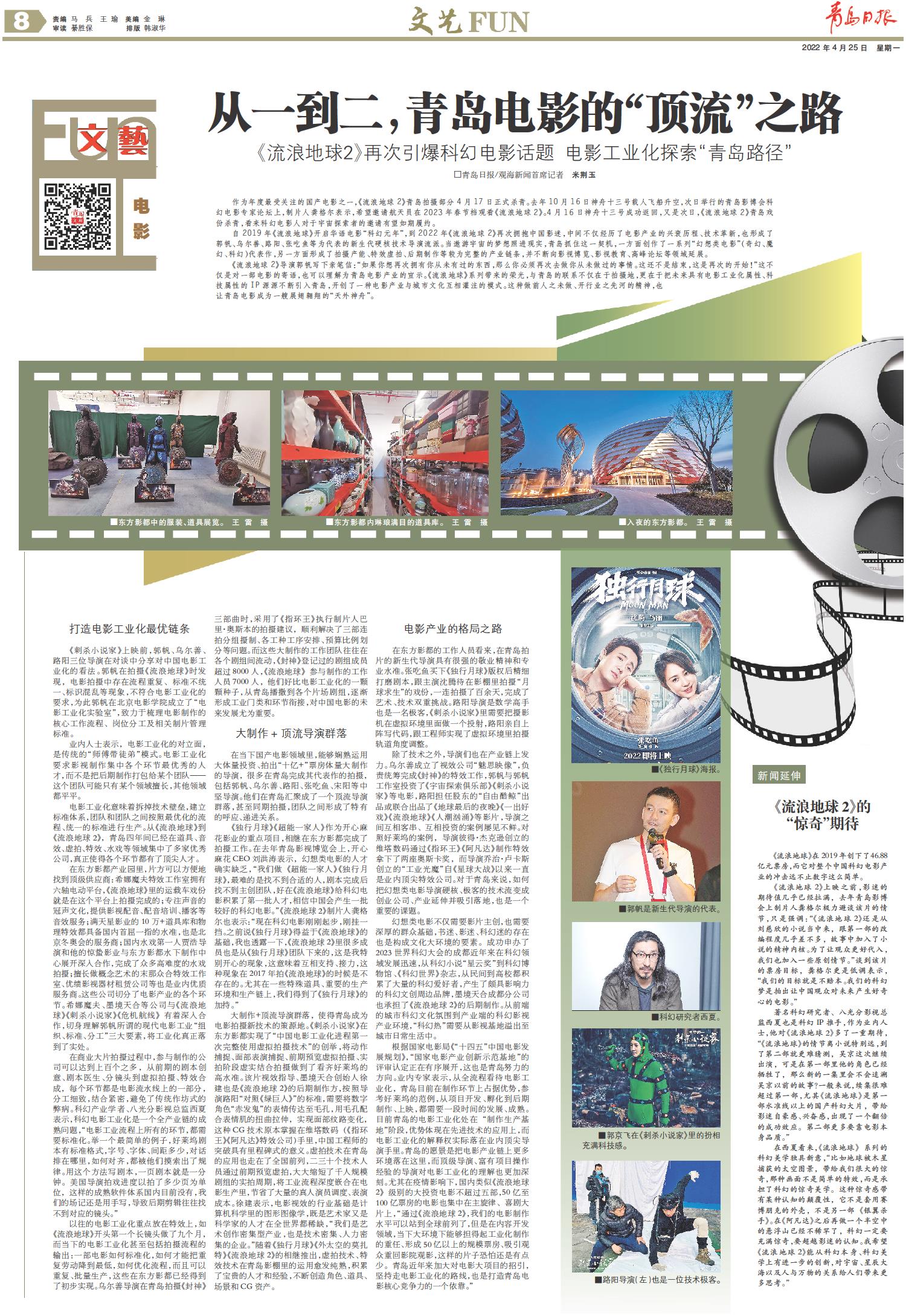 在当下国产电影领域里,能够娴熟运用大体量投资、拍出“十亿+”票房体量大制作的导演,很多在青岛完成其代表作的拍摄,包括郭帆、乌尔善、路阳、张吃鱼、宋阳等中坚导演。他们在青岛汇聚成了一个顶流导演群落,甚至同期拍摄,团队之间形成了特有的呼应、递进关系。
