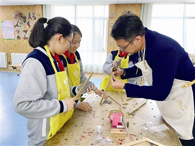 ▲青岛爱迪学校的科创课堂上,学生制作手工作品。