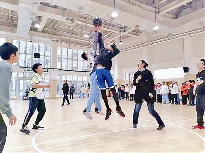 ▲青岛第四实验初级中学体育节,校长蔺彦(右二)为篮球比赛开球。