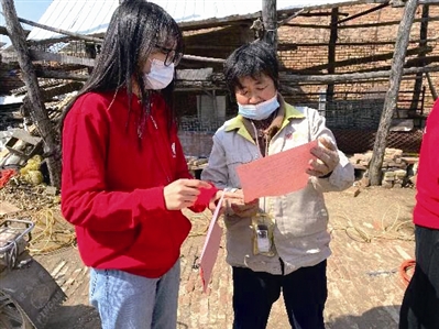 ■青岛农业大学资源与环境学院研究生姜晓芹(左)为村民分发宣传材料。