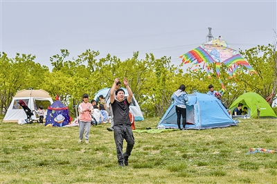 图⑦:“五一”假期,不少市民来到祥茂河湿地公园,露营放松。 于 滈 摄