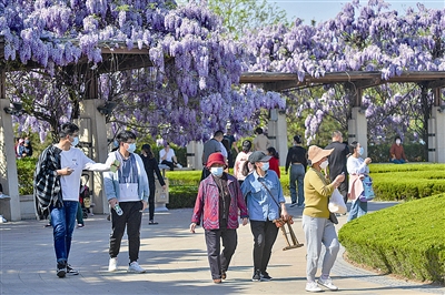 图⑧:“五一”假期,胶州大沽河度假区内的紫藤花迎来盛花期,吸引了众多游客前来观赏。 于 滈 摄