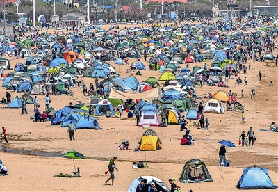 图14:5月3日,很多市民在石老人海水浴场搭起五颜六色的帐篷。赵健鹏 摄