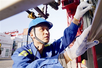■周强在港口作业一线检修设备。