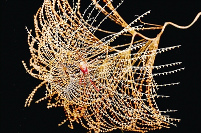 ■上图:不同大小的捕蝇草海葵和单体的长茎海绵共生在一起。 ■下图:“科学”号发现的金柳珊瑚。