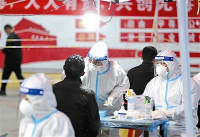 ■崂山区社区卫生服务中心的医护人员在董家下庄社区采集核酸样本。 韩 星
