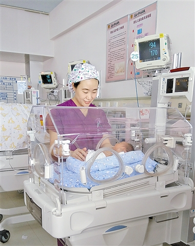 ■青大附院新生儿科护士长吴倩照护新生儿。