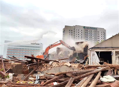 为贯彻落实市、区关于城市更新和城市建设工作有关部署,日前,在市北区老楼院改造和历史文化街区品质升级工作中,多处违建被集中整治。在市北区合肥路街道夹岭沟小区,街道综合行政执法中队执法人员组织挖掘机、装载机、洒水车、运输车等机械,对小区内一处违建依法拆除。伴随着大型机械的轰鸣声,一处处违建应声而倒,洒水车同步洒水降尘,运输车辆及时清理废弃瓦砾,整个拆除工作安全有序、配合默契。这一违建共830平方米,内部划分为17个房间,原是某房地产开发商承建夹岭沟小区和附近小区时盖的临建民工工棚,但小区建成后,该房地产开发商没有将工棚及时拆除,而是留作办公用房,使小区楼座之间的公共区域显得十分拥挤,小区居民反映强烈。
