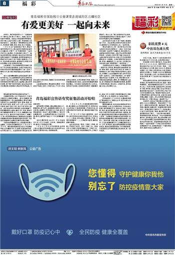 中国福利彩票从1987年诞生至今,已成为中国历史上持续时间最长、参与人数最多,筹集善款最多的一项公益慈善事业。青岛市福利彩票发行中心始终秉承“扶老、助残、救孤、济困”的发行宗旨,坚持“公开、公平、公正”的发行原则,践行“取之于民、用之于民”的初心使命,在社会各界的支持和爱心彩民的奉献下,积极筹集福彩公益金。截至2021年底,青岛市累计销售福利彩票337.15亿元,筹集福彩公益金近95亿元,重点用于资助为老年人、残障人士、孤儿和有特殊困难的人群服务的社会福利设施建设和受助对象直接受益的项目等,为促进社会福利和公益事业发展作出突出贡献。