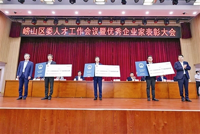 为青岛冠中生态股份有限公司董事长李春林、青岛易来智能科技股份有限公司董事长姜兆宁和青岛镭测创芯科技有限公司董事长吴松华等3名2021年度国家级高层次人才兑现奖励360万元,向海尔集团公司董事局主席、首席执行官周云杰等共73个优秀企业家(高管团队)颁发“发展功勋奖”“杰出成就奖”“优秀贡献奖”“新锐贡献奖”……会议现场,崂山区一次性发放约5166万元奖金,向“合伙人”们展示爱才、惜才、尊才的“崂山温度”。