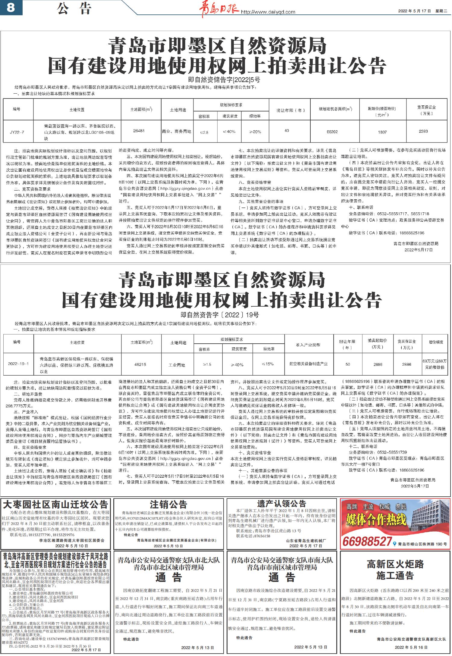 青岛市即墨区自然资源局国有建设用地使用权网上拍卖出让公告