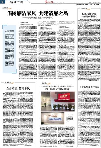 阵地建设是倡树廉洁家风、弘扬新时代廉洁文化的重要基础。一直以来,崂山区坚持从革命文化、社会主义先进文化、中华优秀传统文化资源中汲取养分,将“清廉之美”融入“品质新城”,打造了一批布局合理、独具特色、引人入胜的“廉洁地标”。比如,围绕“山水润性·明道昭廉”主题,将崂山传统道家文化与廉洁文化建设有机结合,打造了“崂山道廉文化馆”;在金家岭街道,以“清风徐徐、廉从心生”为主题,打造“廉洁文化生活圈”;在中韩街道,围绕“花语清风”主题,打造“枯桃廉洁文化园地”;在沙子口街道北崂社区,深入挖掘胡氏家训《竹庐家聒》的文化内涵,打造“峄阳清风馆”;在王哥庄街道青山社区,将廉洁文化与“最美渔村”民情风俗相结合,打造廉洁文化展馆;在北宅街道,深入挖掘明代监察御史蓝章创建的“华阳书院”以及蓝氏家风文化底蕴,打造“华阳清风馆”;将清廉元素融入自然景观,将廉洁教育融入旅游民宿,指导崂山旅游集团精心打造廉洁文化展馆“清心小筑”等等。