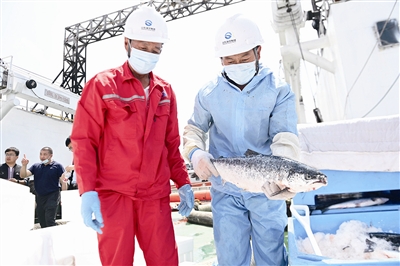 ■我国首批深远海大西洋鲑在西海岸新区积米崖码头上岸。 俞方平 摄