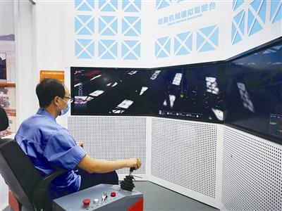 ▲工作人员正在起重机械模拟驾驶台上操作演示。