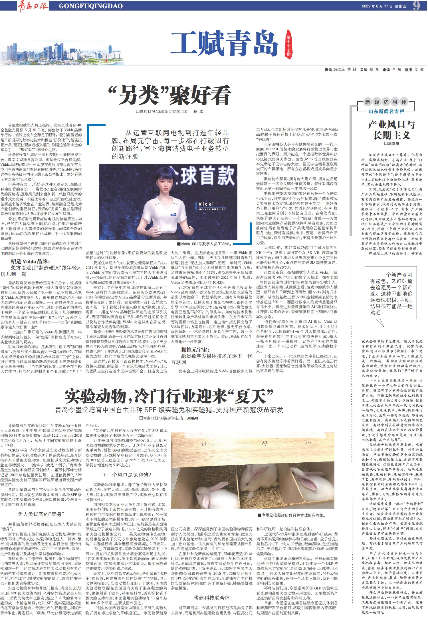 “CRO平台、科学家以及实验动物支撑了新药科研体系,实验动物是这个体系的基础。最开始很多人不重视实验动物,但疫情以来实验动物行业变得特别火,‘一猴难求’就是个例子。”青岛今墨堂生物技术有限公司创始人、董事长邵峰告诉记者,2020年疫情暴发初期,正是他提供的SPF级别实验兔支持了国家科研院所迅速研发国产新冠疫苗。