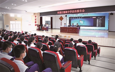 ■即墨区人民法院田横法庭近日走进即墨潮海中学,以“在法治的蓝天下”为主题为1600余名师生上了一堂法治课。法官通过列举发生在中学生身边的真实案例,深入浅出分析涉及未成年人的犯罪类型,并围绕居家安全、高空抛物、毒品危害、网络安全等,讲解法律知识,受到师生的好评。现场还举行了法治副校长聘任仪式,潮海中学聘请即墨法院法官韩爽担任法治副校长并为其颁发了聘书。