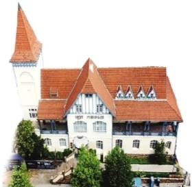 站在建筑面前,参观者很容易被它活泼明快的建筑风格所触动。这栋建筑具有典型的德国新文艺复兴风格,为三段式建筑,砖木结构,采用花岗石砌基,正门南向,非对称布局,外形轮廓丰富。建筑一层为石基砖墙粉面,二层设有木构柱外廓,墙体均涂以极淡的黄色,屋顶为四面坡型,覆以红瓦,道路转角处突起的尖顶塔楼为其立面构图中心。中央入口突起山墙,以强调构图中心。登上台阶走入老建筑内部,穿过大堂就来到了位于大厅的礼堂,这里也是青岛第一个礼堂音乐厅。礼堂采用巴西利卡式设计风格,长20米、宽14米,层高12米,有宽敞的舞台和木结构拱形屋顶,设置木廊楼座,以玻璃罩顶灯和一排北窗自然光作为光源,塔楼之下和外廊扶栏处的交错桁架被用作装饰,具有德国中古时期建筑风格。