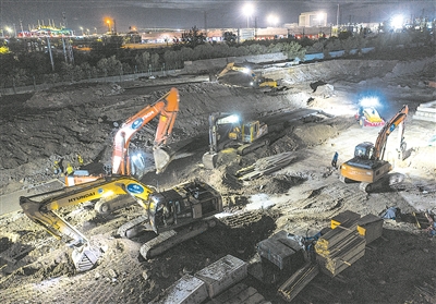 ■唐河路-安顺路打通工程开启“夜间模式”,呈现出一派热火朝天的繁忙景象。