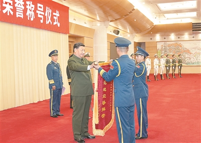 习近平向获得荣誉称号的单位颁授荣誉奖旗。 新华社照片