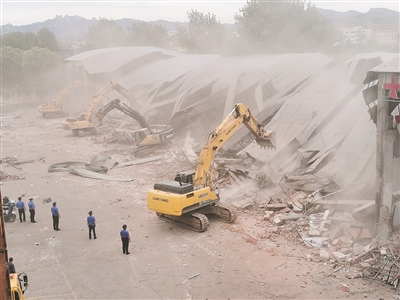 “金梦花园小区建成于2005年。小区建成后,位于宁德路路边小区东门附近原本应该拆除的临时建筑却没有被拆除,一栋两层高的小楼,原本是小区的售楼处,后来变为一家企业的办公楼;还有一片原本的工棚,现在出租给多家商铺在经营,其中居民意见最大的是一处汽修厂。”刘雄峰说,经过市南区多个部门联合现场勘查,根据图纸资料反复研判,明确这两处建筑属于超期临建。随后,由市场监管、行政审批等部门责令相关经营业户立即停止经营行为,综合执法局、街道下达限期自行整改通告,要求企业自行整改。其间,相关部门积极约谈相关企业,努力争取企业的理解和配合。随后,由综合执法、自然资源和规划、公安、城市管理、城市建设、市场监管、街道等部门和单位依法联合下达了拆除通告。7月11日,市南区启动了这处超期临建的拆除工作,截至目前,1475平方米的超期临建已拆除完毕。