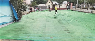 ■市南区金梦花园东门违建已经拆除完毕,建筑工人在覆盖防尘网。 贾 臻 摄